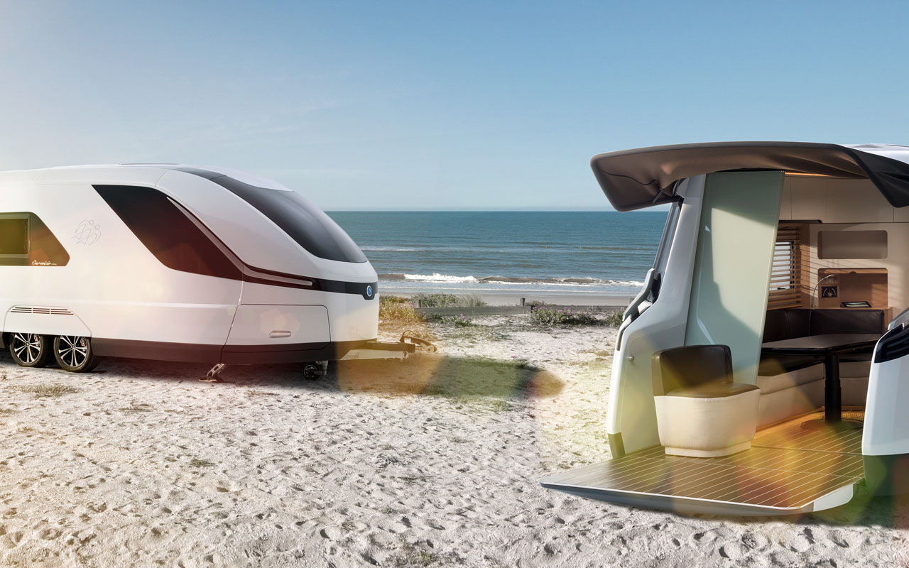 Was man alles mit einem Caravan so veranstalten kann, zeigt die Innovationsstudie Knaus Caravisio. Mehr als 20 Partner der Branche entwickelten an der eleganten Studie, die vor interessanten und in die Zukunft weisenden Lösungen nur so strotzt. So projiziert ein Beamer Inhalte auf die Glasschiebetüre im Heck – und das bei Bedarf auch spiegelverkehrt für ein kleines Public Viewing. Fingerscanner für den Zugang zu Caravan und Staufächern, eine ausklappbare Veranda mit Platz für zwei Pedelecs, luftgefederte Polster in der Sitzgruppe, versenkbare Armaturen in der Küche und ein Bus-System, damit man alle wesentlichen Elemente innerhalb und außerhalb des Fahrzeugs mit einer App im Smartphone steuern kann. Wenn das alles mal wahr wird, kann sich manche Wohnung und manches Haus davon eine Scheibe abschneiden.