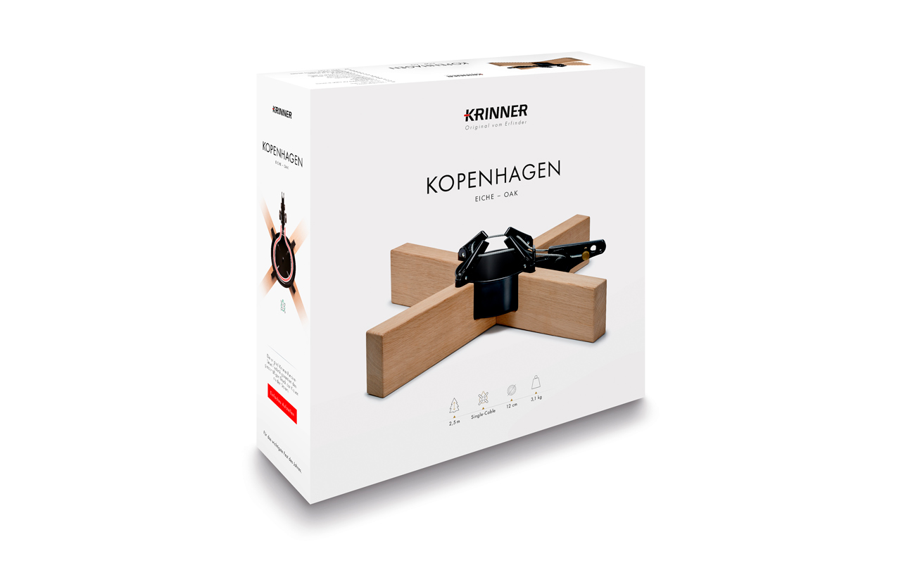 Der Krinner Christbaumständer „Kopenhagen“ steuert der heimischen Weihnachtsdekoration einen skandinavischen Flair bei. Er besticht durch sein elegantes Design und die hohe Qualität, die dank der massiven Stahl- und Eichenkonstruktion jeden Weihnachtsbaum stilvoll in Szene setzt. Dank der simplen Einkabeltechnik wird der Baum nur in den Ständer gestellt und durch das Fußpedal fixiert.
