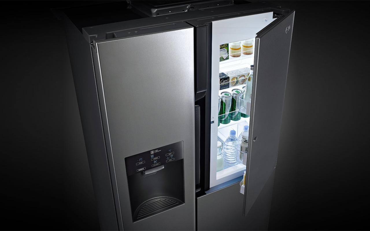 Der Side-By-Side Kühlschrank „GS9366 NECZ“ aus dem Hause LG sticht besonders durch seine hochwertige Oberfläche, sein informatives Display, die unsichtbaren Scharniere und seine edle Rundumgestaltung hervor. Ausstattungen wie Moist Balance Crisper, Total No Frost und Express Freeze sind bei LG Standard. Das Design von LG ist dabei nicht nur stilvoll, sondern auch funktional durchdacht. Es glänzt sowohl durch elegante Linien und Formen als auch durch exzellente Raumausnutzung. Der Door Mounted Icemaker ist hierfür ein ideales Beispiel: intelligente Raumaufteilung in ansprechend modernem Design. Endlich kann man den vollen Komfort eines hochwertig ausgestatteten Side-by-Side Kühlschranks auch ohne den sonst notwendigen Festwasseranschluss genießen. Die Wasserversorgung erfolgt über einen Wassertank (3 Liter), der manuell befüllt oder durch eine 1,5-Liter-Wasserflasche ersetzt werden kann. Das intelligente Tür-in-Tür-System ist nahezu unsichtbar in die Front integriert. Größer als ein normales Barfach erlaubt es die schnelle Entnahme von Lebensmitteln und Getränken, ohne dass die gesamte Kühlschranktür geöffnet werden muss. Eine komfortable und besonders energiesparende Lösung.