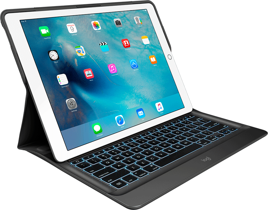 Wer sein iPad Pro zur produktiven Arbeit nutzen möchte, kann dies mit der Tastaturhülle Logitech Create tun. Diese bietet nämlich eine Tastatur im Full-Size-Format, wodurch der 12-Zoll-Formfaktor des iPad Pro voll zum Tragen kommt: Es verwandelt sich zu einem schicken, ultramobilen Touchscreen-„Notebook“. Die Tastaturhülle bietet zugleich Schutz gegen Stöße und wehrt auch Spritzwasser zuverlässig ab – natürlich nicht rundum, aber doch dort, wo sie das iPad Pro umschließt. Kontakt wird automatisch über den Smart Connector des iPad Pro hergestellt, und darüber bezieht die Tastatur auch die notwendige Energie. Im Gegenzug weckt ein Aufklappen der Create das iPad Pro aus dem Stand-By-Modus auf, sodass man keinen weiteren Knopf betätigen muss. Über ein zusätzliches „Gelenk“ im Deckel bietet sie auch gleich die Stütze, dass das iPad wie ein Notebook-Bildschirm sicher auf der Unterlage stehen bleibt.