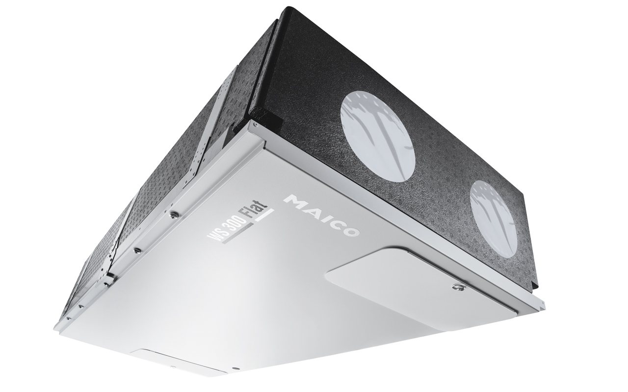 Das Maico WS 300 Flat Lüftungsgerät zeichnet sich durch seine flache Bauweise aus und kombiniert diese mit einer exzellenten Wärmerückgewinnung. Es ist in verschiedenen Varianten für unterschiedliche Einbauorte erhältlich. Durch den permanenten Luftaustausch schafft es ein angenehmes und gesundes Raumklima. Zwei Entalpie-Wärmetauscher garantieren eine effiziente Wärmerückgewinnung. Die Wärmetauscher machen gleichzeitig die Standortwahl flexibel, da kein Kondensatablauf notwendig ist. Die Montage kann in allen Positionen, z.B. wandhängend, an der Decke oder einer Dachschräge, erfolgen. Der Zugriff auf das Gerät funktioniert einfach über ein Smartphone, Tablet oder PC. Außerdem kann das Lüftungsgerät in die Gebäudeleittechnik integriert werden.