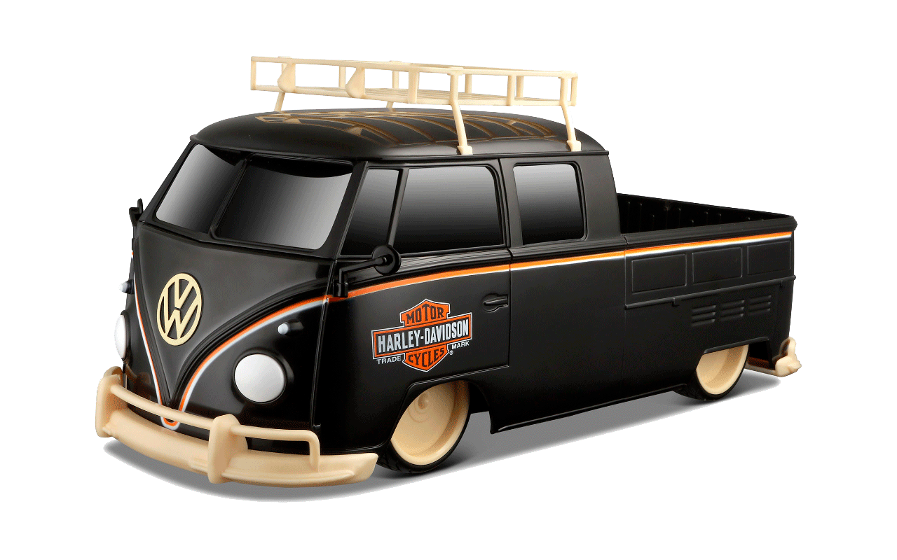 Der Custom VW T2 Pick-up im Maßstab 1:16 ist Teil der Maisto TECH Harley-Davidson Sonderedition und steht für ein besonders cooles Design. Durch die schwarze Lackierung, die zweifarbigen Pinstripes, die massiv tiefergelegte Karosserie und komplett geschlossenen Felgen im Old School Design begeistert der Bus nicht nur Kinder. Dank der im Lieferumfang enthaltenden Pistolenfernsteuerung lässt sich der Pick-up sehr leicht steuern.