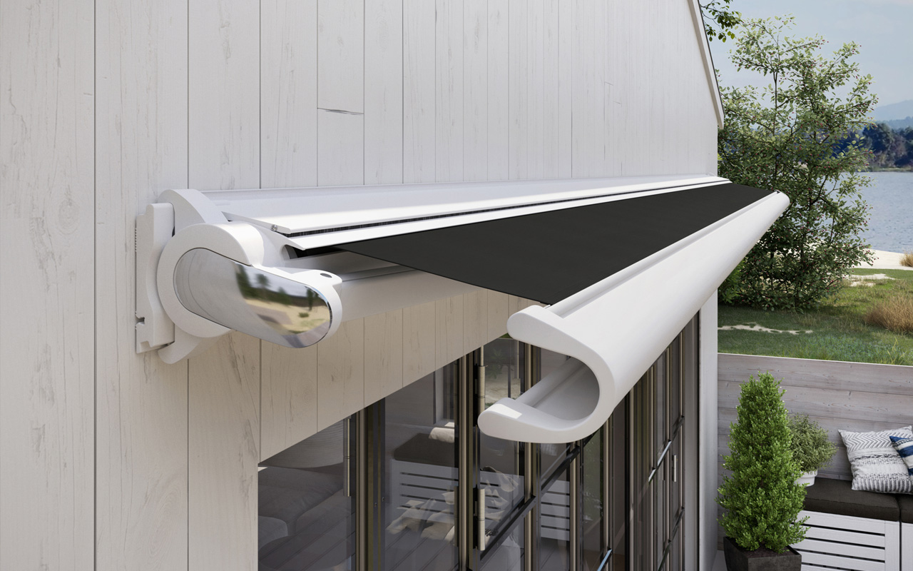Die Kassettenmarkise Markilux 990 ist die kompakteste Markise mit Gelenkarmen der Marke. Die Kassette selbst ist nur 125 mm flach. Die kompakte Konstruktion mit dem U-förmigen Ausfallprofil lässt die Gelenkarme und das Markisentuch aus dem Blick verschwinden. Mit einem Neigungswinkeln von bis zu 70 Grad bei der Deckenmontage eignet sich die Markilux 990 vor allem für den Einbau an kleineren Terrassen und Balkonen. Die hohe Qualität sichert Markilux durch die Produktion von Markise und Tuch unter einem Dach in Deutschland.