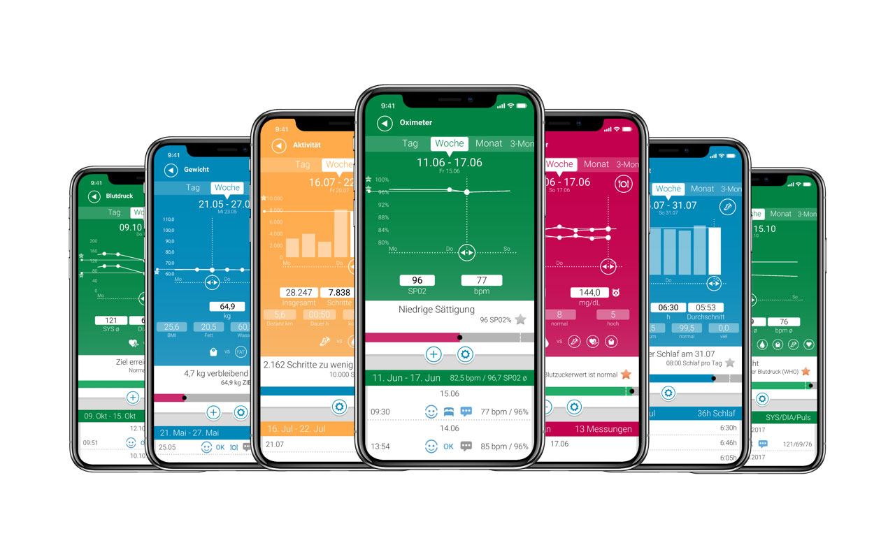 + Erfassung der Werte Blutdruck, Blutzucker, Gewicht, Blutsauerstoff, Temperatur und Aktivität in einer App