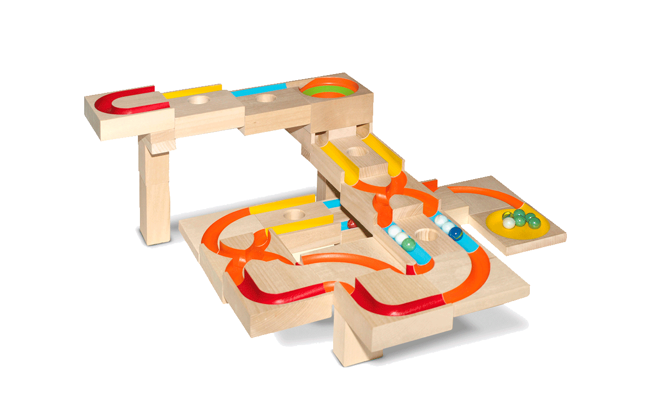 Die Kugelix Duo-Bahn von nic überzeugt durch ihr Design und ihre Funktionalität. Die Optik präsentiert sich natürlich und farbenfroh zugleich dank der Verbindung von Naturholz mit den bunt gestalteten Bahnen und Kugeln. Die Platten können mit Kunststoff-Federdübeln miteinander verbunden und zu unterschiedlichen Laufwegen zusammengestellt werden. Untereinander nutzen die Kugeln einen Billard-Effekt: Auf dem blauen Teil der Bahn werden drei Kugeln eingelegt. Die vierte Kugel rollt von oben über die Bahn und schießt die erste der drei Kugeln weiter – ein Effekt, der Kinder neugierig macht.