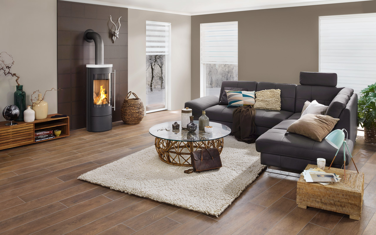 Der OLSBERG Palena Compact Kaminofen verfügt über einen ungewöhnlich hohen Brennraum, der den optischen Fokus auf die Flammen hinter der Panoramascheibe legt. Der Korpus ist aus schwarzem Stahl gefertigt, der durch verschiedene optionale Abdeckungen aus Keramik oder Naturstein an unterschiedliche Wohnumgebungen angepasst werden kann. Die speziell konstruierte Wirbelbrennkammer sorgt für eine optimierte Nachverbrennung, bei der weniger Emissionen und Feinstaubpartikel entstehen. Der belüftete Türgriff garantiert das komfortable und sichere Nachlegen von Brennstoff auch ohne Handschuh, denn er bleibt weitestgehend kühl.