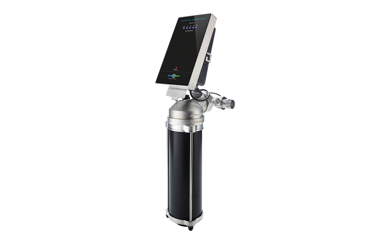 Der „permasolvent primus 2.0“ aus dem Hause perma-trade verhindert Kalkablagerungen in der Haustechnik, erhält die natürliche Trinkwasserqualität und verhindert dabei Energieverluste auch bei hohen Speichertemperaturen. Der Kalkschutz von permasolvent primus 2.0 beruht auf dem elektrodynamischen Verfahren der Impfkristallbildung. Dabei erzeugen Spannungsimpulse eine Polarisierung der Mikroelektroden. Der Kalk haftet sich an den negativ geladenen Teilchen an und wird durch periodische Umpolung in Form von winzigen Kristallen wieder abgelöst. An diese Kristalle, welche in hoher Dichte gebildet werden, lagert sich der bei Erwärmung ausfallende Kalk an und wird mit dem gezapften Wasser ausgetragen. Rohrleitungen und Boiler bleiben somit nahezu kalkfrei, ohne dass der natürliche Kalkgehalt des Wassers und damit der Anteil an wertvollen Mineralien wie Kalzium und Magnesium verändert wird. Dabei arbeitet der permasolvent primus 2.0 automatisch und wartungsfrei. Dank seiner puristisch edlen Aufmachung macht der permasolvent primus 2.0 nicht nur technisch, sondern auch optisch eine gute Figur.
