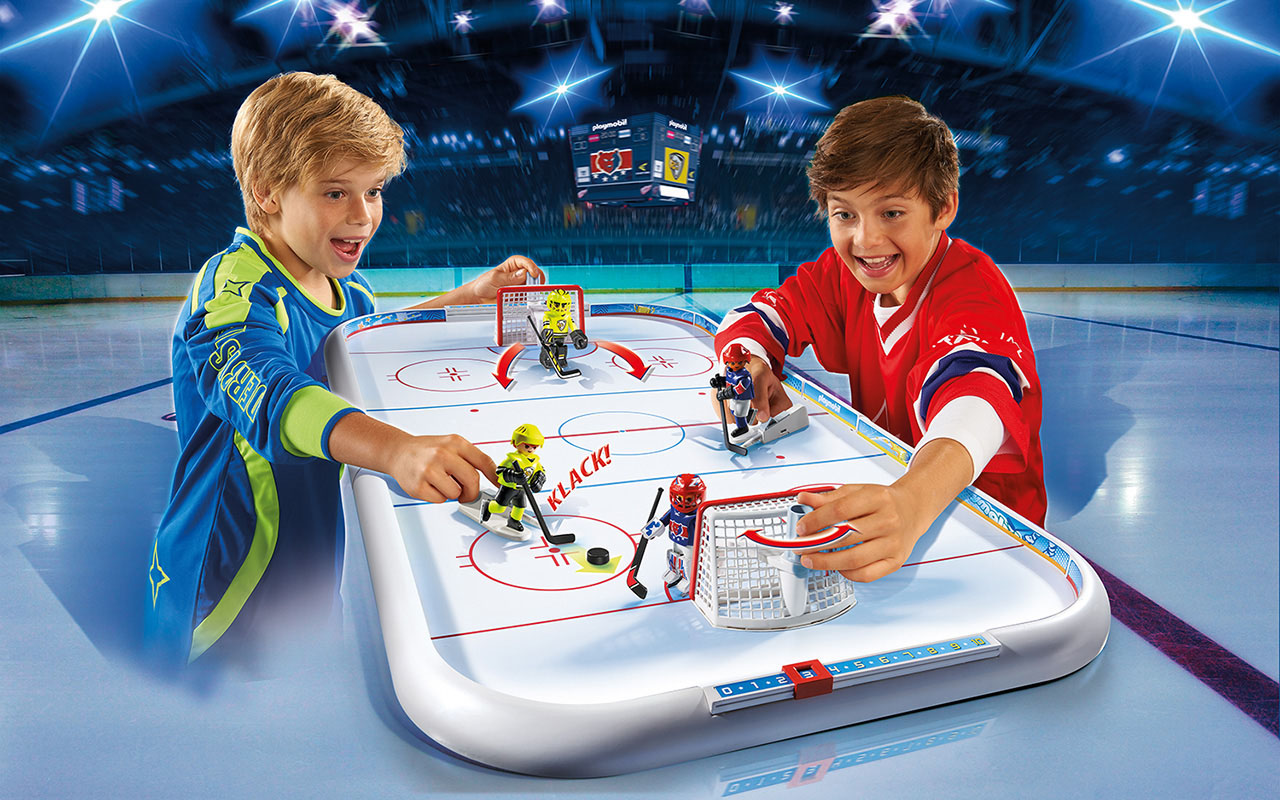 PLAYMOBIL bringt mit der „Eishockey-Arena“ Spielspass und Action ins Kinderzimmer. Mit der raffinierten Einhand-Schussfunktion lassen sich mühelos präzise Schüsse auf das gegnerische Tor durchführen. Die individuell gestaltbaren Feldspieler und Torhüter sowie das authentisch designte Spielfeld sorgen für echte Spannung und Spielspass mit der gewohnten hohen PLAYMOBIL-Qualität.