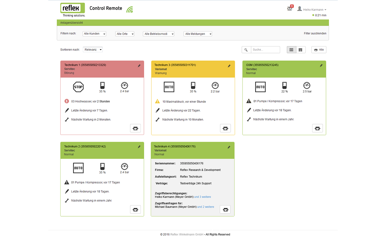 Das Steuerungssystem Reflex Control Remote überzeugt durch Bedienkomfort und Funktionalität. Es dient dazu, komplexe versorgungstechnische Anlagen via Internet von unterwegs oder über einen PC zu überwachen, zu steuern oder Fehler zu analysieren. Die Software passt sich automatisch an das verwendete Endgerät, z.B. Smartphone oder Tablet an. So können beispielsweise bei komplexen Fehlern Experten auf die Anlage geschaltet werden und das Personal vor Ort bei der Fehlersuche unterstützen. Die Benutzeroberfläche ist übersichtlich und intuitiv gestaltet und unterstützt so zusätzlich. Verschiedene Funktionen sichern die Effizienz der Anlage und reduzieren Wartungs- und Servicezeiten. Zusätzlich ist ein Sicherheitssystem integriert, das den unberechtigten Zugriff auf die Anlagen verhindert.