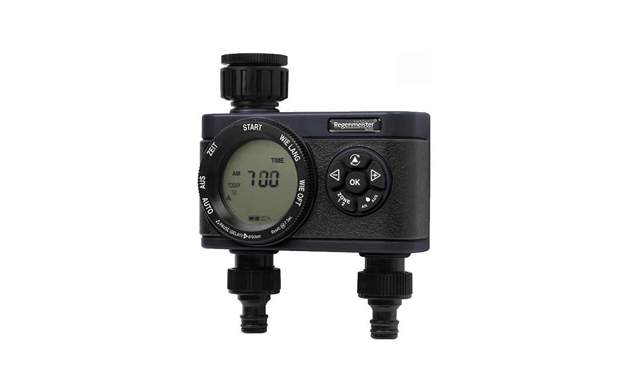 Der Bewässerungscomputer BA292 aus dem Hause Regenmeister punktet in den Kategorien hohe Qualität, Bedienkomfort und Funktionalität. Der Computer ist solide gebaut und wird über Tasten bzw. ein Drehrad programmiert. Das Display ist gut lesbar, die Tasten deutlich fühlbar, so dass die Bedienung einfach zu handhaben ist. Mit dem BA292 können zwei Bewässerungskreisläufe separat programmiert werden und – falls gewünscht – auch ein Feuchtesensor angeschlossen werden. Für die Bewässerung selbst stehen zahlreiche Wahlmöglichkeiten zur Verfügung: Die Bewässerungsdauer kann zwischen einer und 360 Minuten eingestellt werden. Die Bewässerungshäufigkeit entweder im Abstand von Stunden (auch hier kann gewählt werden), an gewählten Tagen oder alle 1 bis 7 Tage programmiert werden.