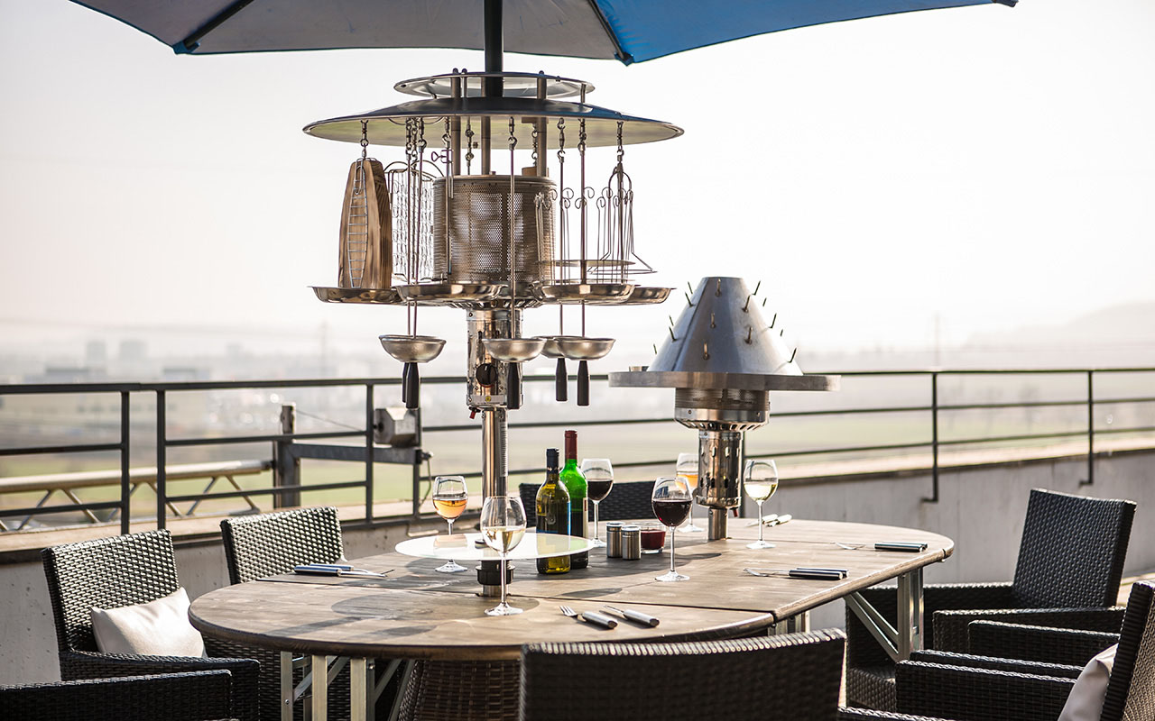 Der Remundi Pro Mobile ist etwas ganz Besonderes: Die runde Tischgrillkombination mit Bänken oder Sesseln lädt zum gemütlichen Grillen mit Freunden ein. Der Gas-Grill besteht aus Stahl oder Polyrattan sowie verschiedenen Aufsätzen, wie Platten und bis zu sechs Gondeln. Die Gondeln drehen sich um ihre eigene Achse und ermöglichen so die gleichmäßige Bräunung des Gargutes. Durch die Schale, in der sich das heruntertropfende Fett sammelt, lässt sich der Grill leicht reinigen. Und auch wenn es kühler wird, können Sie entspannt auf den Bänken in dunkel oder naturfarben verweilen, denn vom Heizstrahler geht ausreichend Wärme aus.