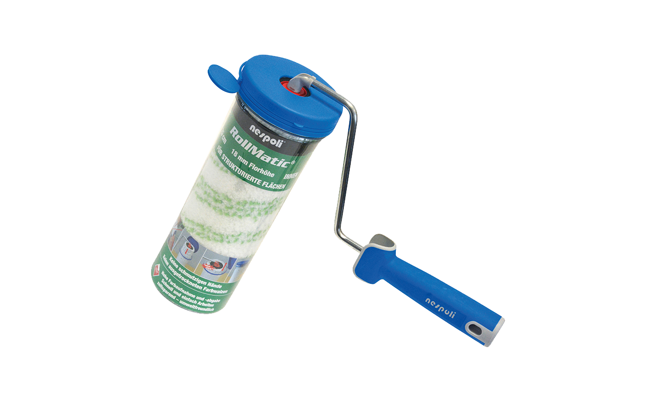 Der RollMatic Farbroller ist eine Innovation mit hoher Qualität und Bedienkomfort. Die Besonderheit: Ein Klicksystem löst die Farbwalze vom Farbrollerbügel. Die Hände bleiben sauber. Die Aufbewahrungsbox sorgt dafür, dass die Walze nicht austrocknet. Der RollMatic Farbroller verfügt außerdem über eine Teflon-Oberfläche. Sie hat eine höhere Farbaufnahme und -abgabe und ermöglicht so das noch schnellere Arbeiten.