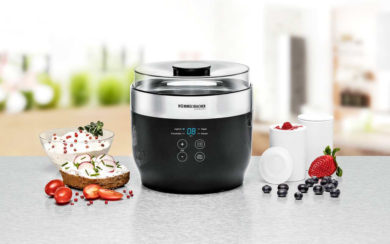 Der Joghurtbereiter JG 80 „Jona“ aus dem Hause Rommelsbacher eignet sich für die Zubereitung von Joghurt und anderen Gerichten wie veganer oder laktosefreier Joghurt, griechischer Joghurt, Frischkäse, Sauerteig und sogar Kräuterextrakten. Dabei bieten die Glasbehälter ein Volumen von je 1,2 Litern, so dass auch größere Mengen kein Problem darstellen. Die Qualität zeigt sich an den verwendeten Materialien: BPA-freie Kunststoffe, rostfreier Edelstahl, Glas und Porzellan machen den JG 80 „Jona“ aus. Vier Programme und die Zeiteinstellung machen die Bedienung komfortabel, die helle LED-Anzeige ist gut lesbar.