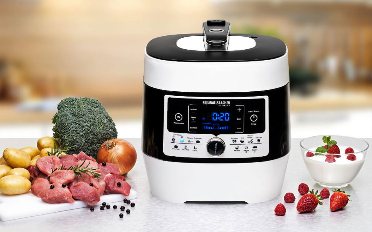Bis zu neun Küchengeräte ersetzt Rommelsbachers MD 1000 „Mein Hans“, ein digital gesteuerter Dampfdruck- und Multikocher. Mit 14 Kochprogrammen und einem Garraum mit vier Litern Fassungsvermögen eignet er sich auch zur Versorgung eines Haushalts mit vier bis fünf Personen.