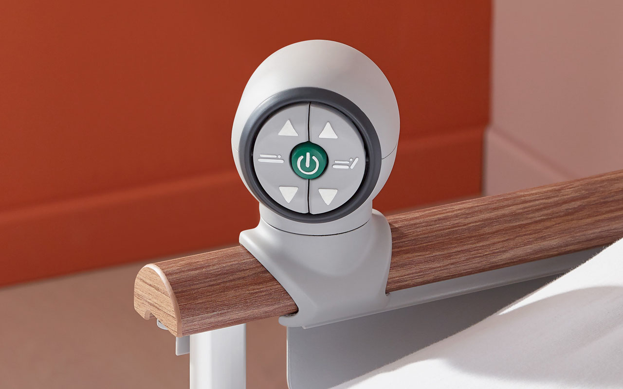 Ein ergonomischer, kabelloser Bediensatellit zur Bettensteuerung ist der SafeLift von Wissner-Bosserhoff. Der Mobilisationsassistent kommuniziert über EnOcean-Funktechnologie mit der Technik des Bettes.
