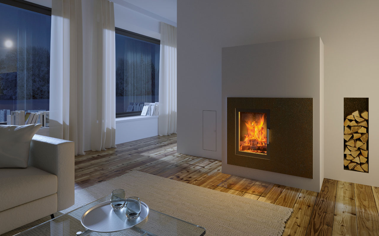 Auch ohne Keller kann mit dem Schiedel Absolut Design-Fertigfuß ein Schornstein für einen Kamin so ins Haus integriert werden, dass keine sichtbaren Revisionsschächte und -türen die Harmonie des Einrichtungsbildes stören. Eine bündig eingefasste Tür ist das einzig sichtbare Element.