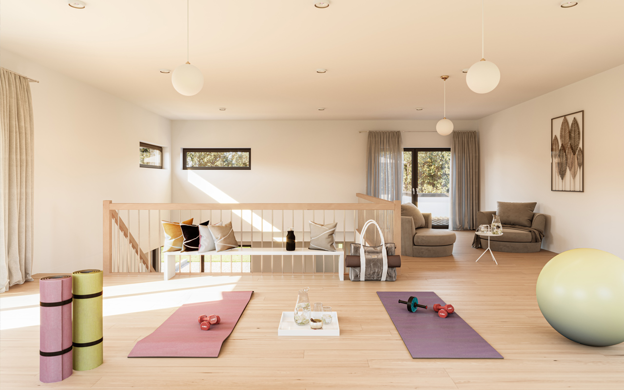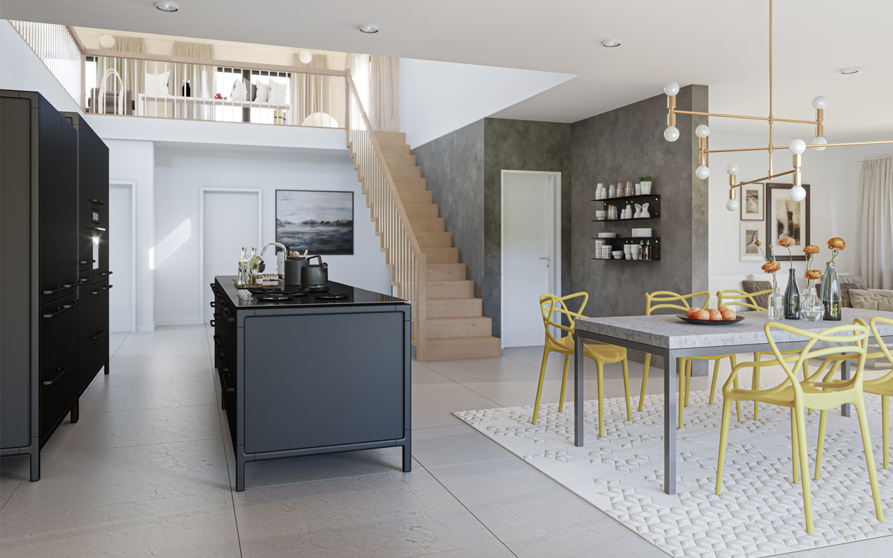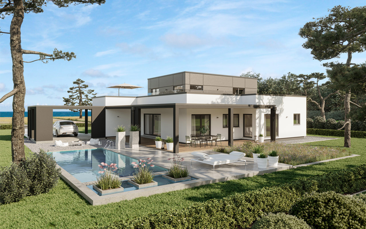 Dieser moderne Bungalow aus der beliebten Solitaire-Reihe von Schwabenhaus beeindruckt unter anderem mit einem Obergeschoss-Modul, das das Master-Schlafzimmer und das Badezimmer ins Obergeschoss verlagert oder alternativ ein großes Studio entstehen lässt. Auch die Fassadengestaltung aus weiß und anthrazit, der Carport sowie der großflächige Balkon inklusiver formschönem Glasgeländer sowie das Obergeschoss-Modul zeichnen den Bungalow aus. Die EnOcean-Technik ermöglicht intelligentes Gebäudemanagement für Licht- und Rollladensteuerung, ein Smarthome-System übernimmt die Steuerung von Be- und Entlüftung, Heizung, Kühlung und Sicherheit sowie Zutrittskontrolle. Optimale Energiestandards werden erreicht dank der nachhaltigen Bauweise und der innovativen Haustechnik.