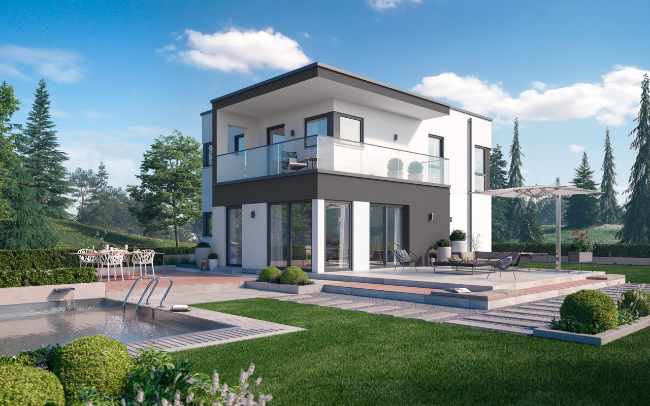 + Fertighaus-Entwurf mit Flachdach