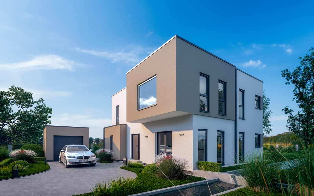 + Fertighaus mit Flachdach und Erker im Obergeschoss
