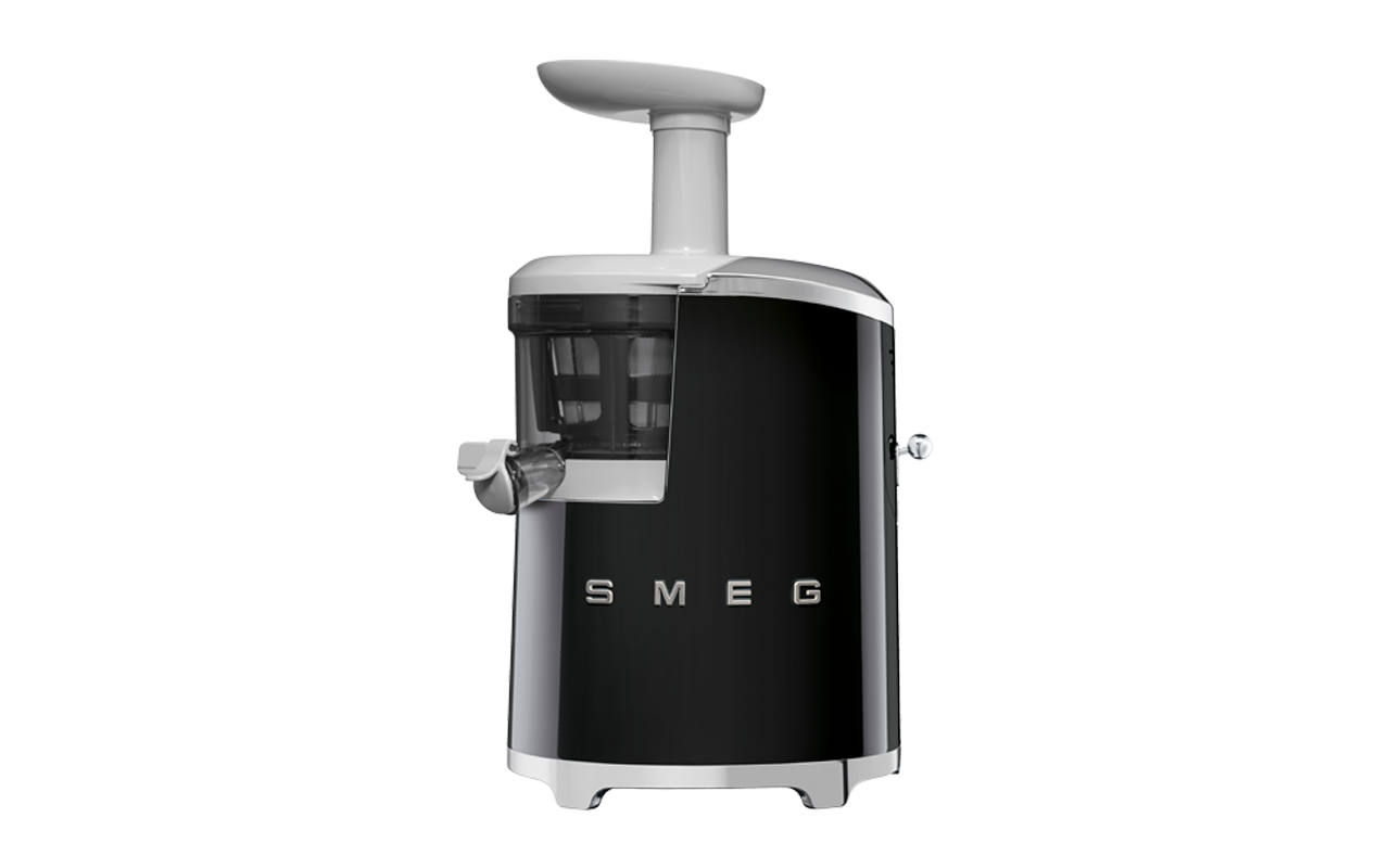 Die 1950er Jahre bleiben aktuell, und hier sieht man, dass auch andere Farben als knalliges Rot hip waren: Der Smeg Slow Juicer SJF01PBEU kommt in einem pastelligen Hellblau – manchmal auch unter dem „Babyblau“ bekann. Unter der sauber verarbeiteten Außenhaut aus Kunststoff arbeitet ein modernes Werk, das mit der Slow Squeezing Technologie und gerade mal 43 Umdrehungen in der Minute alles aus frischem Obst oder Gemüse heraus holt, was an Nährstoffen und Saft darinnen nist. Vier rotierende Wischblätter sorgen am Saftrührer für besten Nährstoffgehalt. Bei Bedarf kann der Motor umgepolt werden, um auch noch den letzten Rest an Saft aus Obst oder Gemüse herauszuholen.