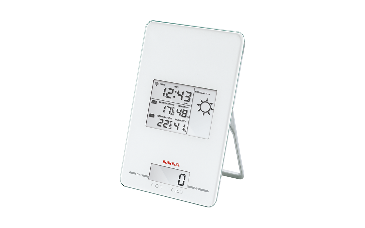 Weit mehr als nur eine Küchenwaage. Soehnles Page Meteo Center vereint die Wiegefunktion mit Uhr, Timer, Wecker und der Funktion einer Wetterstation. So wird aus dem Spezialisten ein Multitalent, das dauerhaft seine Berechtigung auf der Küchenzeile hat. Die Waage wiegt bis zu 5 Kilogramm, und das grammgenau, und der Außensensor gibt zuverlässig Auskunft, ob draußen brillantes Wetter oder eher ungemütliche Schauer lauern.