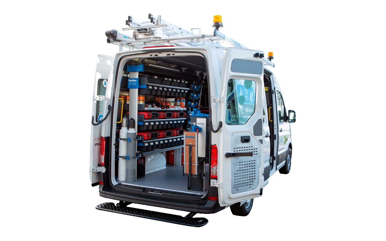Mit der Fahrzeugeinrichtung Sortimo SR5 schafft Sortimo maximalen Laderaum auch in kleinen Autos und sorgt für einfachen Zugriff auf unterschiedliche Arbeitsmaterialien. Das System kann für ganz verschiedene Fahrzeuge und Einsatzbereiche individuell konfiguriert werden. Die verwendeten Materialien Metall, Kunststoff sowie Faserverbundstoffe sind leicht und trotzdem stabil. Die Formsprache ist reduziert und steht für Leichtigkeit und Übersichtlichkeit. Dank der individuellen Konfiguration kann die passende Arbeitshöhe eingestellt werden; die klappbare Werkbank macht Arbeiten am Fahrzeug auf der richtigen Höhe möglich.