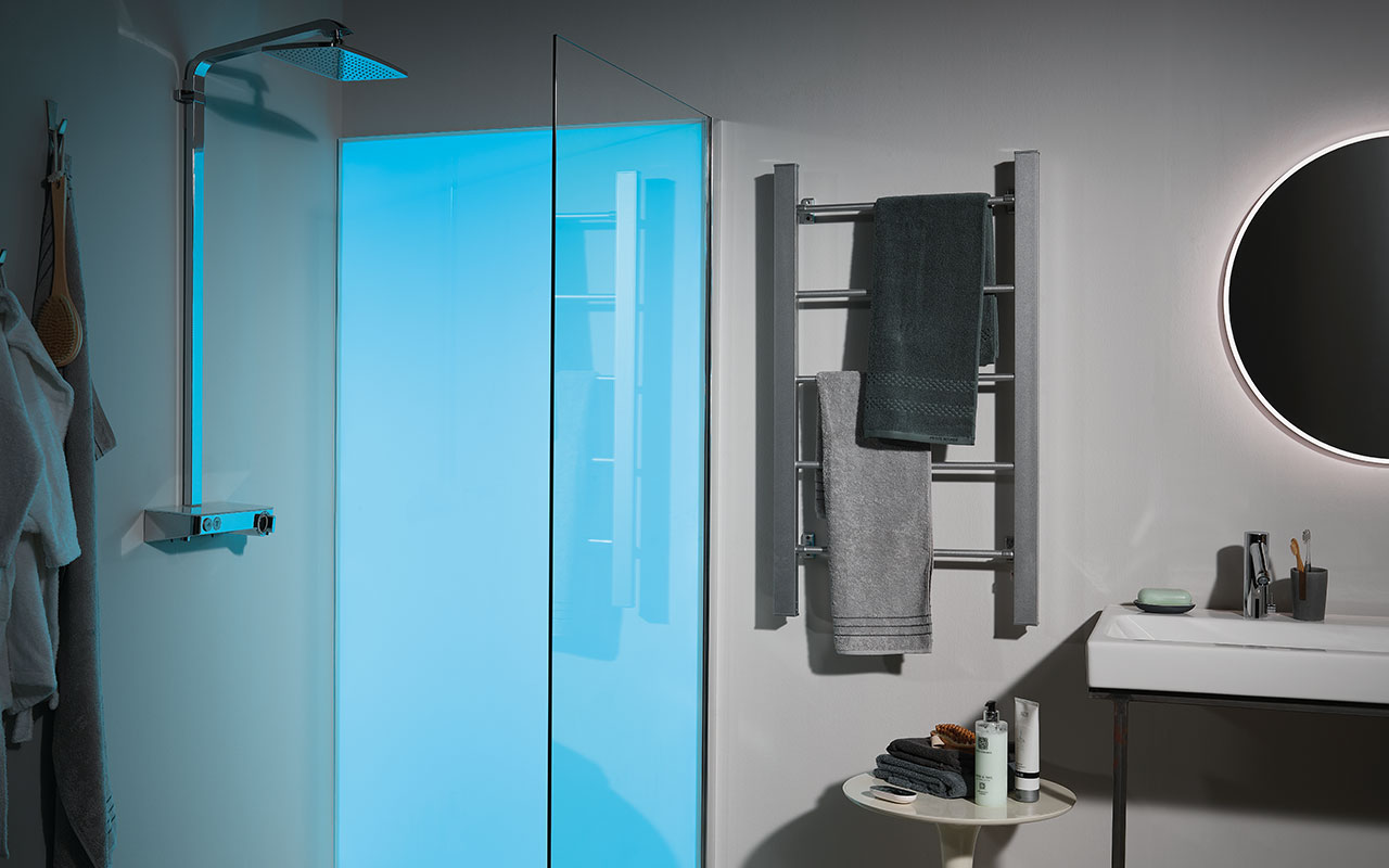 Die Rückwandverglasung Sprinz System Premium LED schafft neue Gestaltungsmöglichkeiten im Bad. Gefertigt aus 6 mm Einscheibensicherheitsglas, kann sie bis zu einem Maximalmaß von 1500 bis 3000 mm verbaut werden. Das Licht der LED-Rückwand ist wahlweise in Kaltweiß, Mischweiß oder mit einem RBG-Farbwechsel erhältlich. Dank der LED-Leuchten ist der Energieverbrauch gering, die Lebensdauer mit 50.000 Stunden hoch.