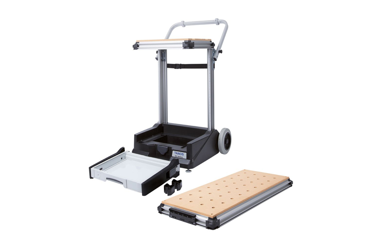 Die mobile Werkstatt MW1000 von Tanos bietet dem Handwerker seine Werkstatt auf der Baustelle. Das System besteht aus einem Auszug und einem Tisch, die sich transportsicher an der Basis befestigen lassen. Die kompakte Einheit überzeugt durch ihre durchdachte Bauweise und einfache Bedienung. Mit dem verstellbaren Griff lässt sich die Werkstatt leicht auf- und abbauen sowie zum Transport zusammenklappen. Dank des Fahrwerks ist die MW1000 treppengängig, eine Tragemulde sorgt für die einfache Verladung ins Fahrzeug. Tisch und Basis bilden aufgebaut eine Ebene, so dass auch größere und längere Gegenstände gut bearbeitet werden können; verstellbare Füße sichern den stabilen Stand.