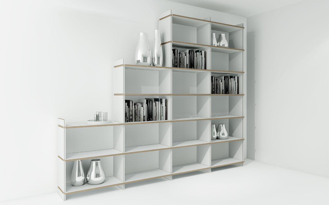 Ganze Regalwände ohne Werkzeug und verbindende Elemente aufbauen ‒ das geht mit dem Regalsystem Tojo-mehrfach. Die einzelnen Segmente werden einfach wie auf Schienen zusammengesteckt und halten so stabil Kontakt.
