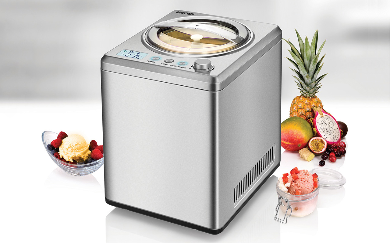 Bis zu zwei Liter Speiseeis kann die Unold Eismaschine Profi zubereiten, und das bei vorgekühlten Zutaten innerhalb von gerade mal 30 Minuten. Dafür ist auch der integrierte Kühlkompressor zuständig, der im Gefrierbereich auf bei zu -35 Grad Celsius herabkühlen kann. Drei Programme mit Zeitintervallen stehen zur Verfügung, und zusätzlich kann ein Timer von 5 bis 60 Minuten programmiert werden. Der robuste Motor der Eismaschine ist dabei auch im Dauerbetrieb laufen – auch größere Gruppen können so mit leckerem Eis versorgt werden. Über eine LCD-Anzeige gibt die Maschine darüber Auskunft, welchen Programmteil sie gerade ausführt und wie lange es bis zum Genuss noch dauern wird.