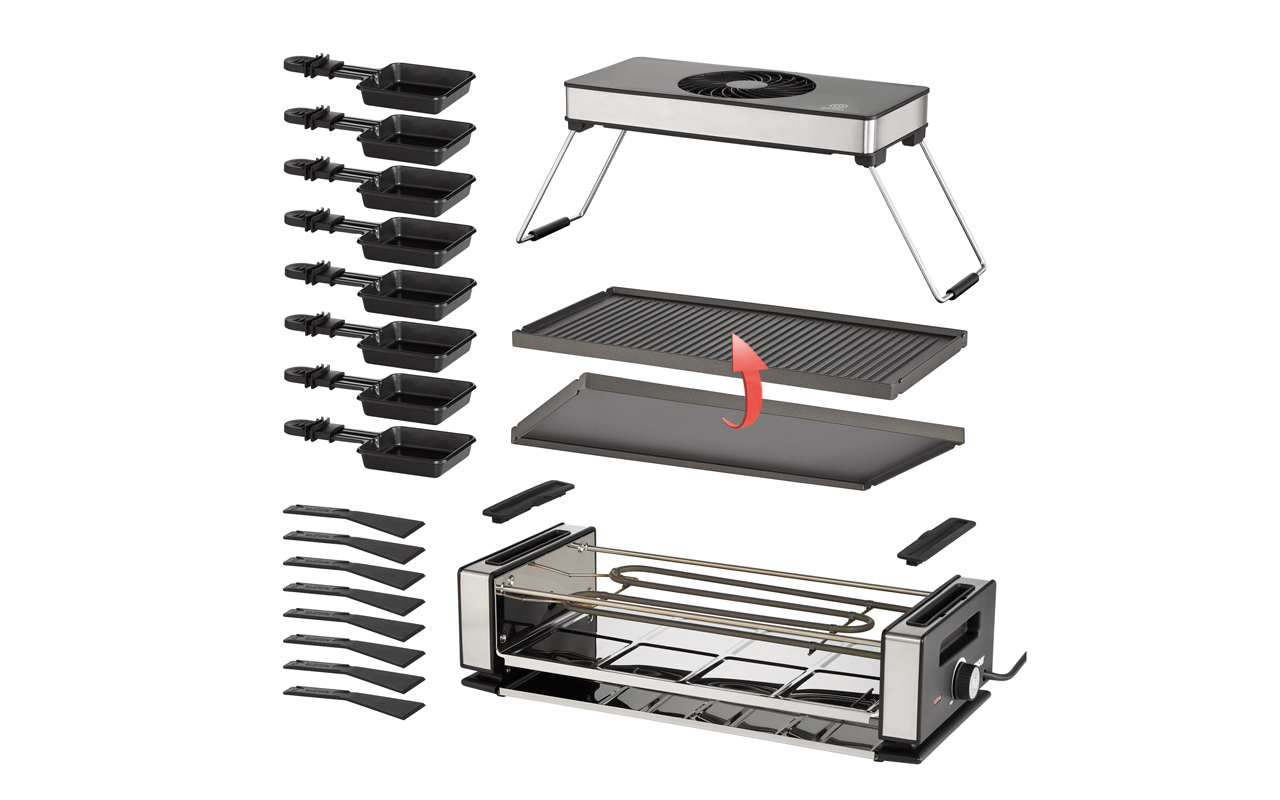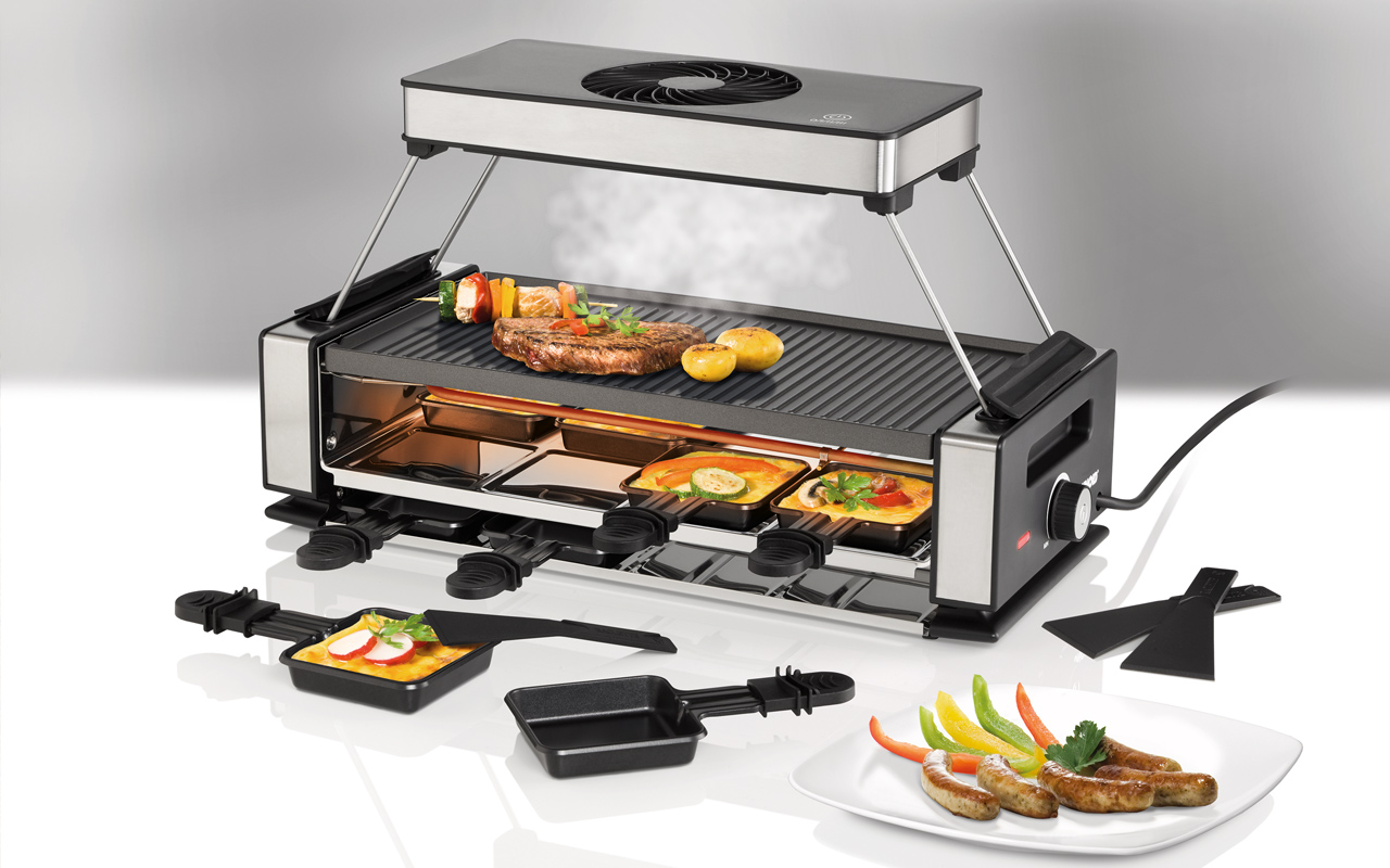 Raclette begeistert jung und alt und das schon lange nicht mehr nur zu Weihnachten und Silvester. Wenn aber doch nur der Rauch nicht wäre. Unold hat dieses Problem erkannt und bietet mit Raclette Smokeless eine simple wie geniale Lösung: Ein Raclettegrill mit einer abnehmbaren Dunstabzugshaube mit austauschbarem Aktivkohlefilter, drei Geschwindigkeitsstufen und klappbarem Gestell. Das moderne Edelstahl-Design mit den Edelstahlblenden und -pfännchen begeistert genauso wie die stufenlose Temperaturregelung. Dunstfreier Raclette-Spaß für bis zu acht Feinschmecker.