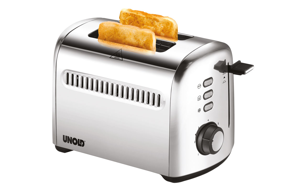 Auch für den kleinen Haushalt bietet Unold mit dem Toaster 2er Retro hat Unold ein trendiges Küchengerät. Im hochwertigen Edelstahlgehäuse finden 2 Scheiben Toast Platz, wahlweise aber auch dickere Brotscheiben oder sogar Bagels. 7 Röstgrade sind einstellbar.