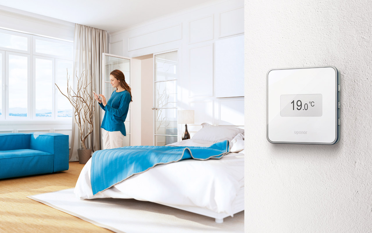 Der hoch elegante Raumthermostat Uponor Smatrix Style misst Lufttemperatur und den Anteil an Wärmestrahlung durch Flächenheizung mit ultrapräzisen Sensoren. Gleichzeitig ist er per Funk oder Kabel vernetzt, auch zum Smartphone, das dadurch zur Klimasteuerung genutzt werden kann.