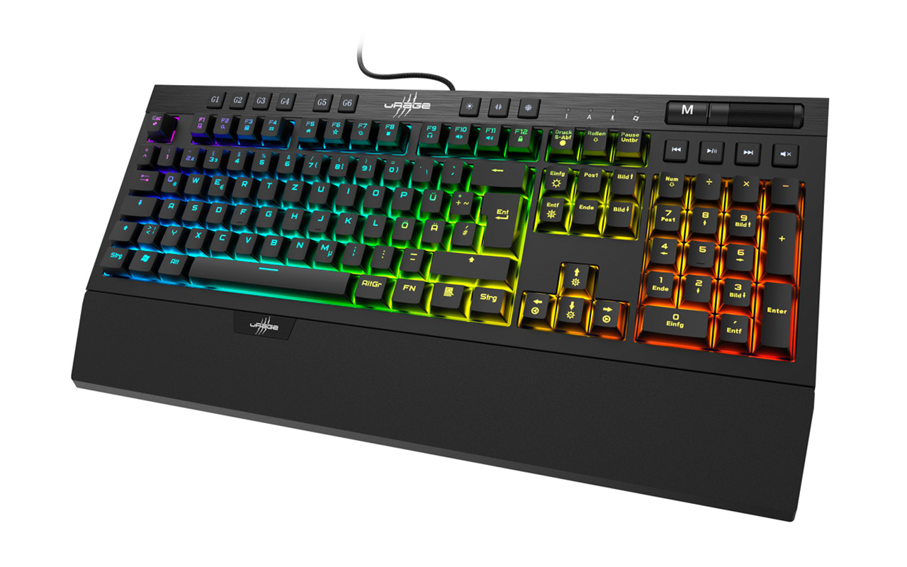 Das Gaming Keyboard Exodus 900 Mechanical von uRage sticht besonders duch seine Outemu Brown Switches hervor. Sie bieten dem Nutzer ein eindeutiges, taktiles Feedback und schlagen bei jedem Druckpunkt direkt lautlos an. Damit wird die Tastatur reaktionsschnell und langlebig zugleich und eignet sich zum Spielen ebenso wie zum Schreiben. Zahlreiche Features erleichtern die Bedienung. Dazu gehört beispielsweise die an- und ausschaltbare Tastenbeleuchtung im RGB-Farbspektrum, die seitliche Beleuchtung sowie der integrierte Speicher für Makro- und Beleuchtungseinstellungen und einzeln programmierbare Tasten. Hochwertige Bauteile aus gebürstetem Metall stehen für Design und Qualität gleichermaßen. Der Drehregler für Lautstärke und Beleuchtungsintensität sowie die abnehmbare, magnetische Handballenauflage runden das Angebot der Tastatur ab.