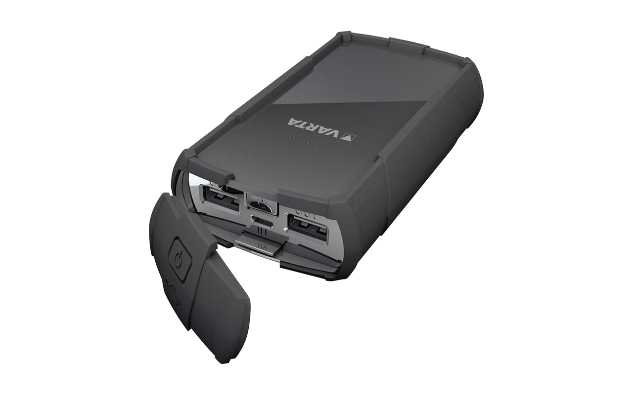 6.000 mAh, das reicht für 3 Smartphones oder auch mehrere Tablets. Vartas ausgewachsenes Powerpack bietet noch mehr Dampf und kann mit zwei USB-Ausgängen auch mehrere Devices gleichzeitig laden. Ein Druckschalter versschafft Gewissheit bei der Inbetriebnahme und LEDs als Ladeanzeige sorgen vor der Reise für ein beruhigendes Gefühl. Auch der 6000er hält Fallhöhen bis 2 Meter aus und trotz Staub und Feuchtigkeit.