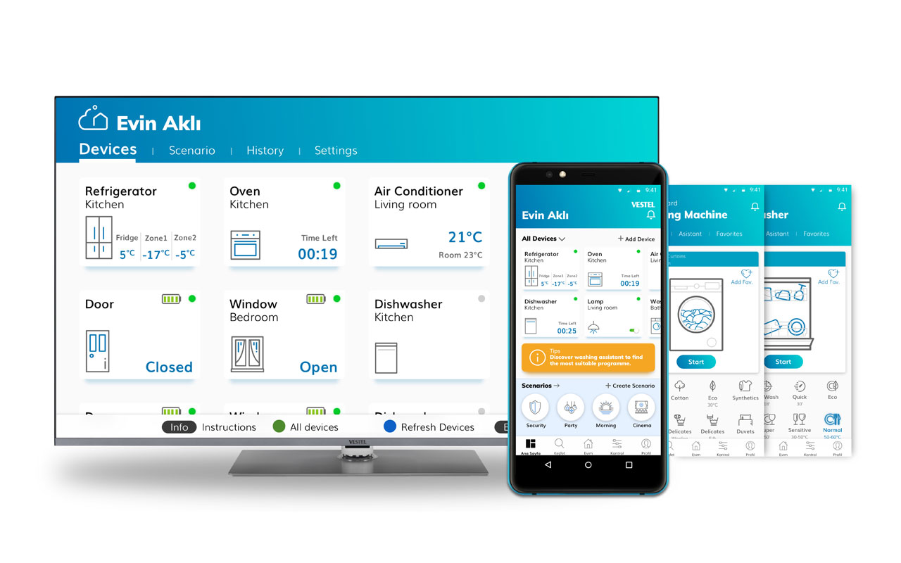 Mit der Evin Akli App hat Vestel eine Innovation geschaffen, die dem Nutzer den Zugriff auf seinen Fernseher und alle verbundenen Haushaltsgeräte von unterwegs bietet. Er hat außerdem die Möglichkeit, individuelle Szenarien zu schaffen und einzelne Geräte zu Gruppen zu verbinden. Gleichgültig, ob Waschmaschine oder Backofen: Die Nutzung der App erhöht Komfort und Sicherheit.