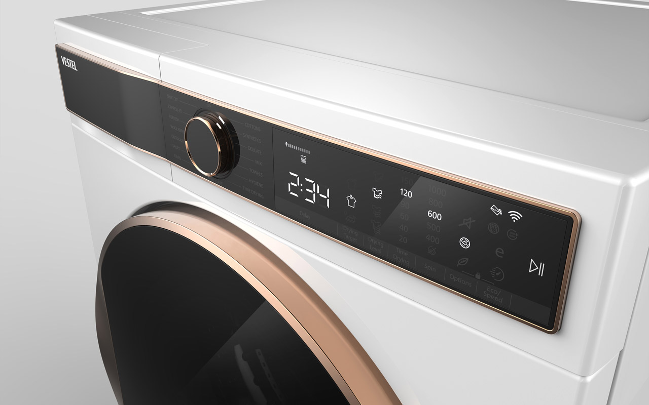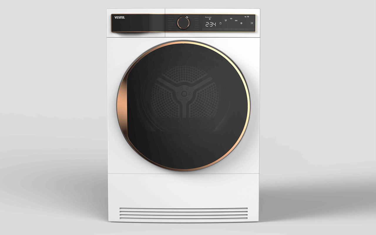 Der Vestel T40 Wäschetrockner zeichnet sich durch seine schwarze Oberfläche und die Kupferumrandungen aus, die sich zu einem einzigartigen Design verbinden. Das Bedienfeld und die Knöpfe wirken dabei als herausragende Elemente. Dank der intuitiven Touch-Steuerung ist der Wäschetrockner leicht zu bedienen. Die Trommel des T40 ist extra groß, so dass auch größere Mengen an Kleidung oder Bettdecken gut hineinpassen. Die „Natural Ion Tech“ gibt ionisierte Teilchen in die Luft ab und verbessert so zusätzlich die Luftqualität im Trockner