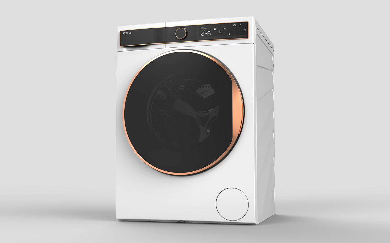 Der elegante Stil der Vestel T40 Waschmaschine zeichnet sich durch die Zusammengehörigkeit von weißen Oberflächen und Kupferrahmen aus. Die bezaubernde Harmonie von schwarzen und kupfernen Teilen macht das Bedienfeld, den Knopf und die robust aussehende Tür zu unverwechselbaren visuellen Elementen der Maschine. Die hervorstechende schwarze Oberfläche der Waschmittelschublade verleiht der Platte eine edle Dynamik und schafft Raum für einfaches Greifen in die Schublade. Eine klar gestaltete und leicht verständliche Benutzeroberfläche bietet eine intuitive Berührungssteuerung und praktische Erfahrung.