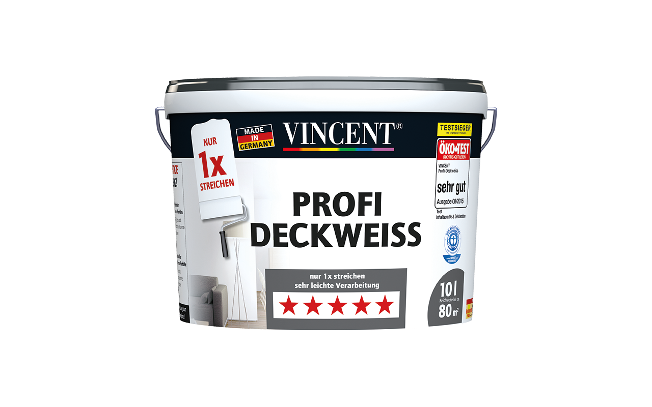 Die Profi Deckweiss Wandfarbe von Vincent wurde ausgezeichnet in den Kategorien hohe Qualität, Funktionalität und Ökologie. Sie ist dank ihrer hohen Deckkraft (Klasse 1) besonders für dunklen oder verschmutzten Untergrund geeignet. Neben der Deckkraft bringt sie eine hohe Reichweite sowie eine geringe Spritzneigung mit und ist leicht zu verarbeiten. Die Profi Deckweiss Wandfarbe kann auf Raufaser, Vlies- oder Vinyltapeten sowie alten Farbanstrichen auf Dispersionsbasis verwendet werden. Die ökologische Verträglichkeit wird unter anderem durch das Siegel des „Blauen Engel“ bestätigt.