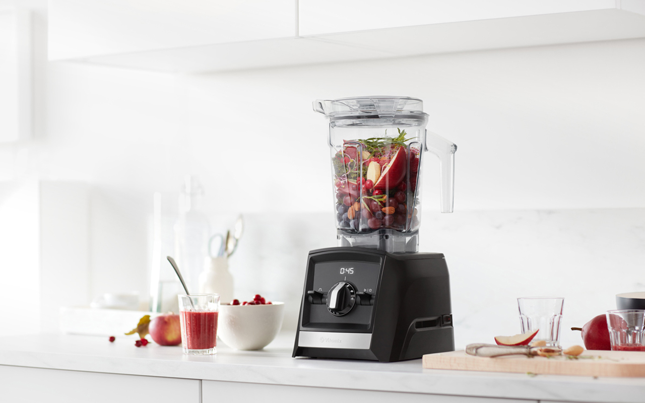 Hochwertige Verarbeitung und massive Bedienelemente bietet schon der Vitamix A2500 aus der Ascent-Serie. Mit ihm können im Handumdrehen heiße Suppen, erfrischend-cremiges Eis, grüne und Fruchtsmoothies, Dips und alles zubereitet werden, was heiß oder kalt mit frisch zerkleinerten Zutaten gemacht werden muss. Mit seinem kräftigen 2,2-PS-Antrieb beschleunigt der Standmixer die Messerspitzen auf bis zu 300 km/h, was auch locker ausreicht, um Eiswürfel für Cocktails in Crushed Ice zu verwandeln. Bis zu zwei Liter passen in den mit einem Stopfer ausgestatteten Behälter, in dem sich die Messer mit 1.500 bis 22.000 Umdrehungen pro Minute drehen. Genug Power und Geschwindigkeit für heiße, frisch gekochte Suppen ist also vorhanden.