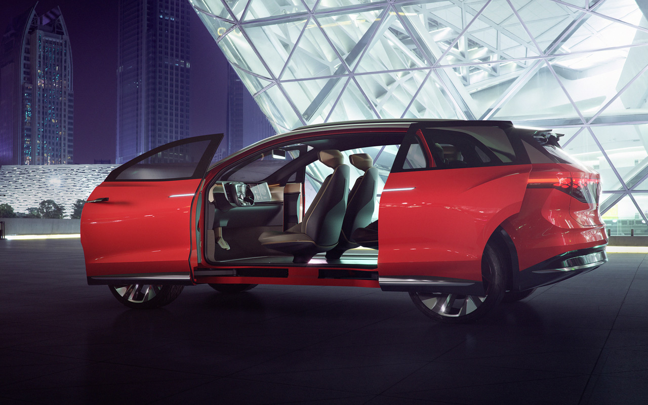 Mehr als 4,91 Meter lang und mit vier Schiebetüren zeigt sich der Volkswagen ID. Roomzz als ausgewachsenes SUV, das voll von innovativen Ideen ist. Dazu gehören eine in der Größe variable dritte Bremsleuchte als „Vorhang“ im Heckfenster und Autonomie-Funktionen auf dem Level 4.