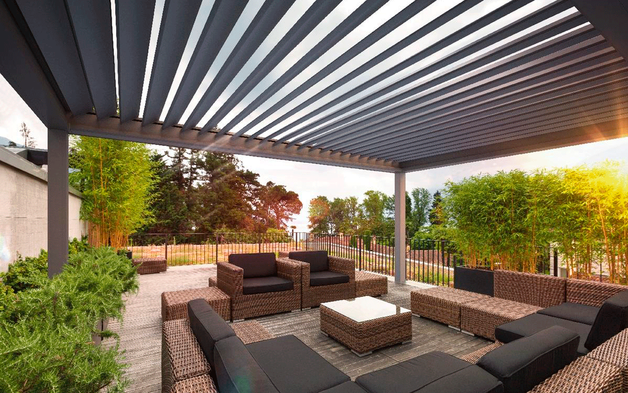 Wohnraum im Freien wird noch lebenswerter, wenn er flexibel beschattet und regendicht gestaltet werden kann, wie es das Lamellendach Warema Lamaxa L70 mit seinen dreh- und verschiebbaren Lamellen ermöglicht.
