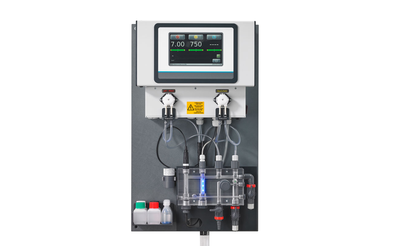 Mess-, Regel- & Dosiergerät für Privatschwimmbäder für Desinfektion, pH-Wert und Temperatur. Die Bedienung erfolgt über ein übersichtliches, bedienerfreundliches 7“ Touch-Grafikdisplay. Das System wird auf einer Montageplatte vormontiert und stückgeprüft ausgeliefert. Ein einfacher, schneller Einbau ist gewährleistet.