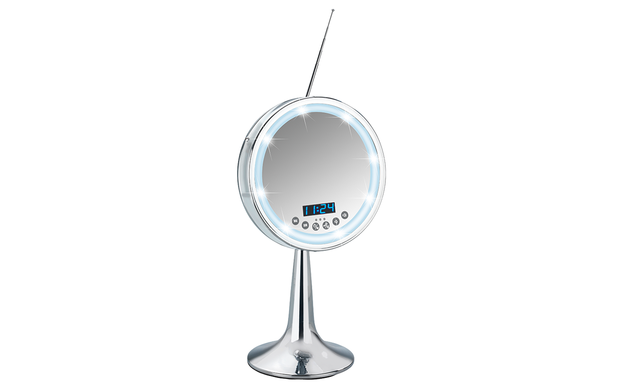 Der Wenko Imperial Standspiegel ist ein funktionelles Produkt für das heimische Bad. Dabei bietet er eine doppelte Funktionalität: Spiegel und Multimedia-Center. Die LED-Beleuchtung des Spiegels ist mit einem Bewegungsmelder versehen. Nähert man sich dem Spiegel, geht das Licht an. Zum präzisen Schminken hat die Spiegelfläche eine 3fache Vergrößerung und lässt sich stufenlos neigen. Außerdem verfügt der Standspiegel über eine Digitaluhr, ein Radio inklusive ausziehbarer Antenne sowie Bluetooth und USB-Port. Damit lassen sich externe Geräte verbinden, beispielsweise um im Bad Musik zu hören. Dank des integrierten Mikrofons ist sogar Telefonieren möglich.