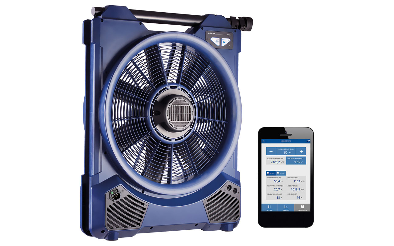Die Überprüfung der Dichtigkeit energieeffizienter Gebäude vereinfacht der Wöhler BC 600 Blower Check auf ein paar Handgriffe und die intuitive Bedienung, Messung, Speicherung und Auswertung auf dem Smartphone. Ohne Knien vor dem Gerät, ohne Umdrehen des Ventilators.