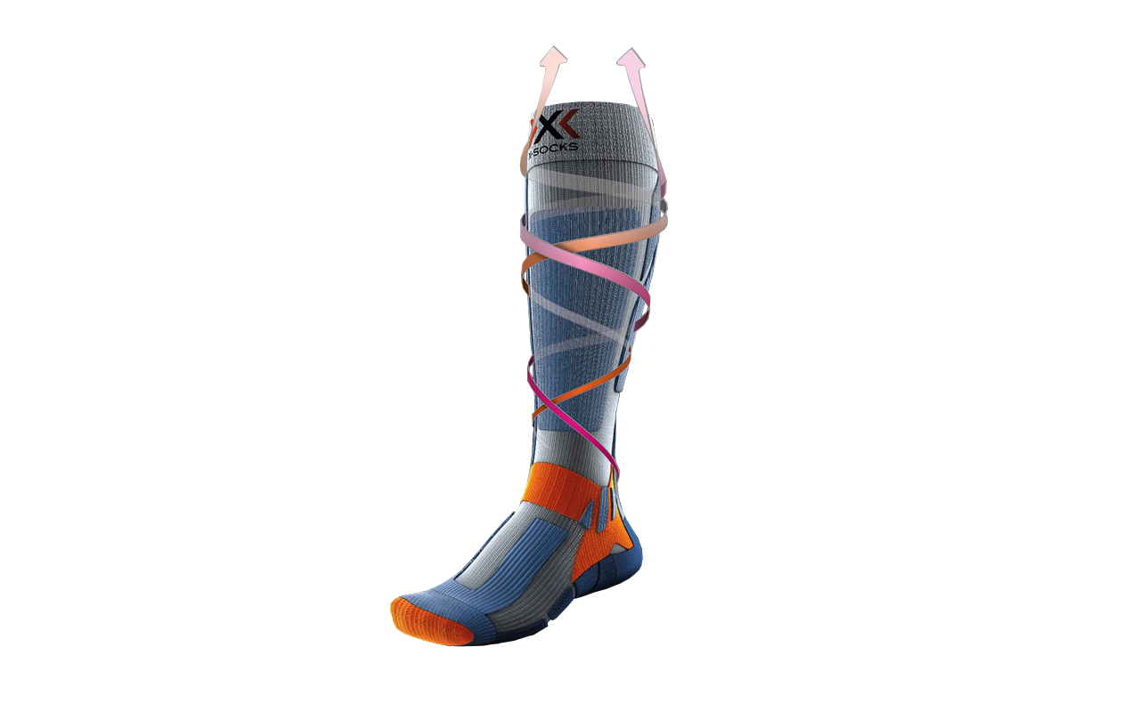 Die Innovation der X-Socks Sportsocken besteht im Doppel-HeliXCoil System, dem ersten seiner Art weltweit. Konzentrische Spiralen federn die Vibrationslast wirksam ab; zusätzlich berücksichtigt das System die Durchblutung.