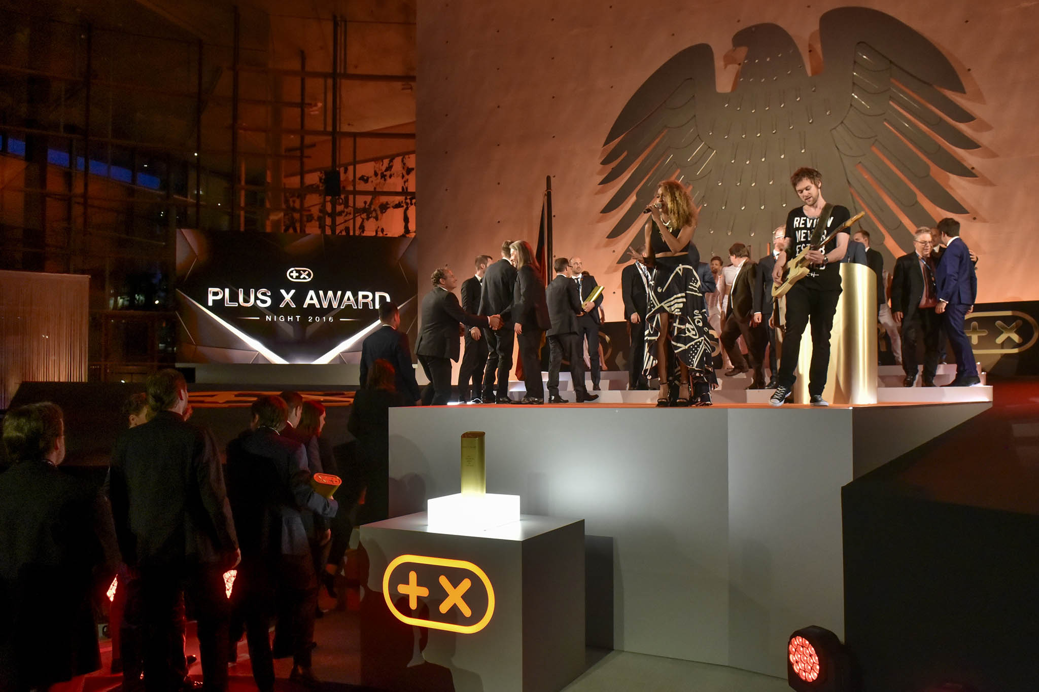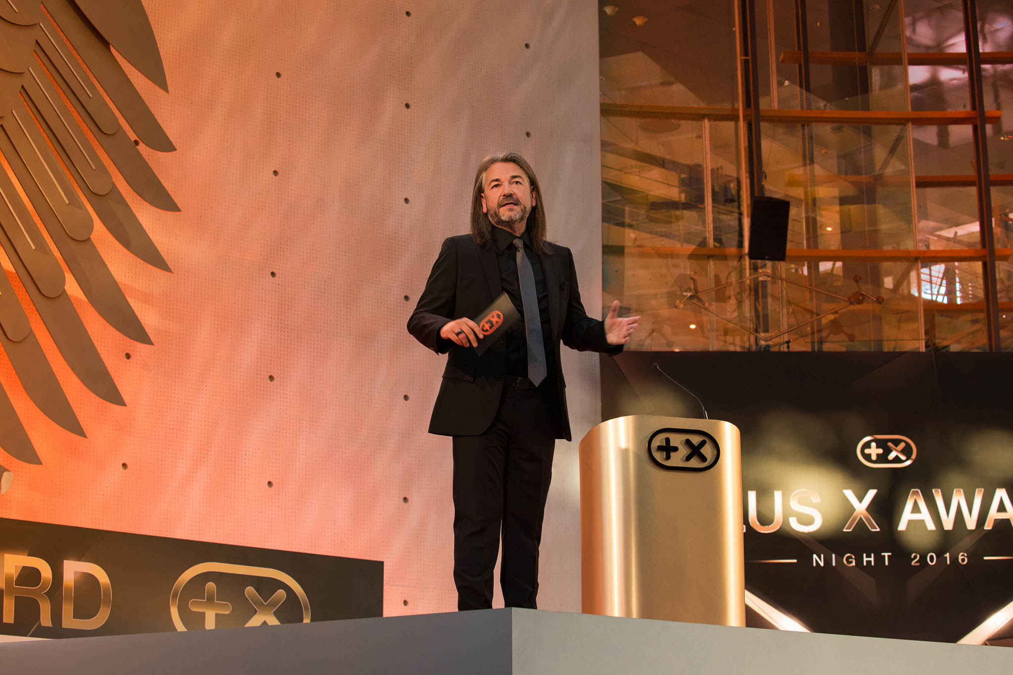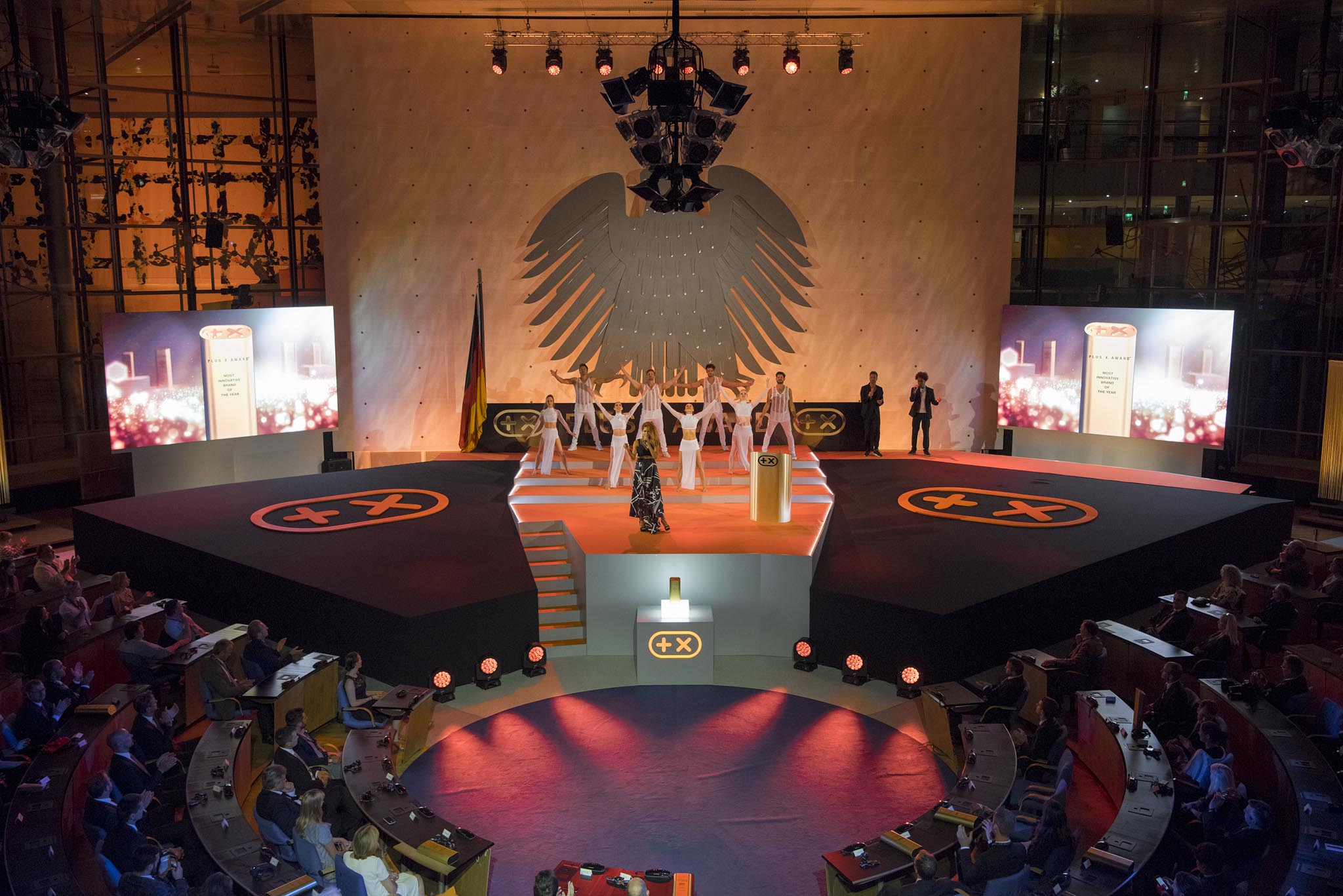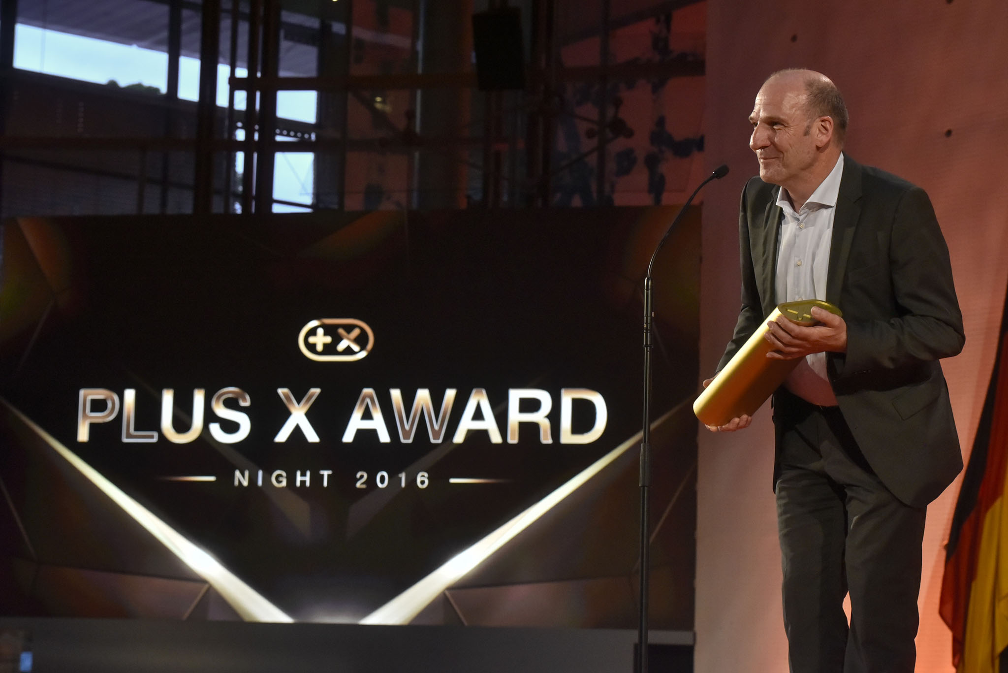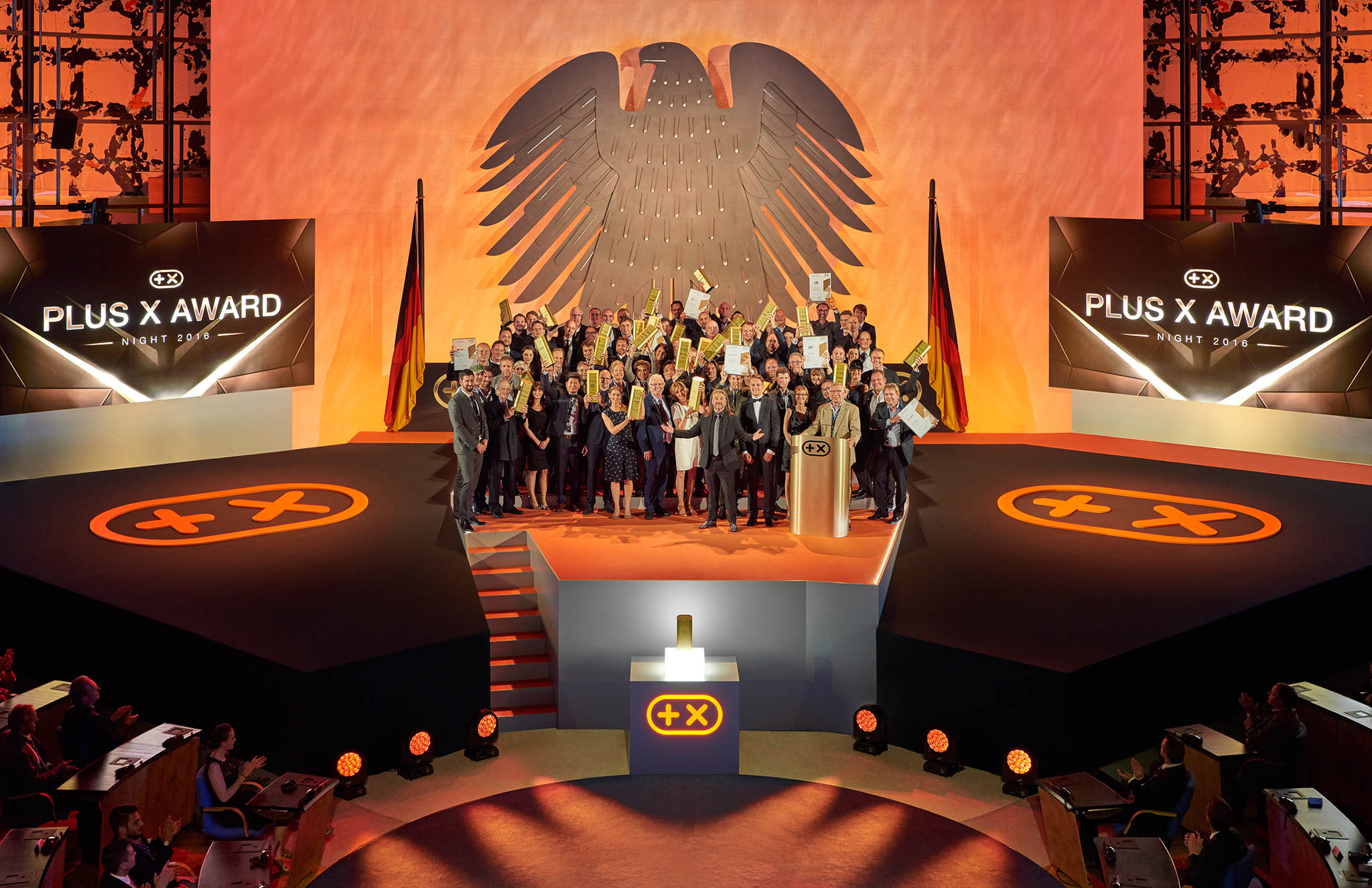 Am Ende des Abends konnten 26 Marken die goldene und fast 7 kg schwere Trophäe aus den Händen der Laudatoren, allesamt Juroren und Botschafter des Plus X Award, in Empfang nehmen. Die imposant gestaltete Bühne, im aufwendig für das Event umgebauten, denkmalgeschützten Plenarsaal, bot den perfekten Rahmen für einen stilvollen Abend mit Premium-Charakter.